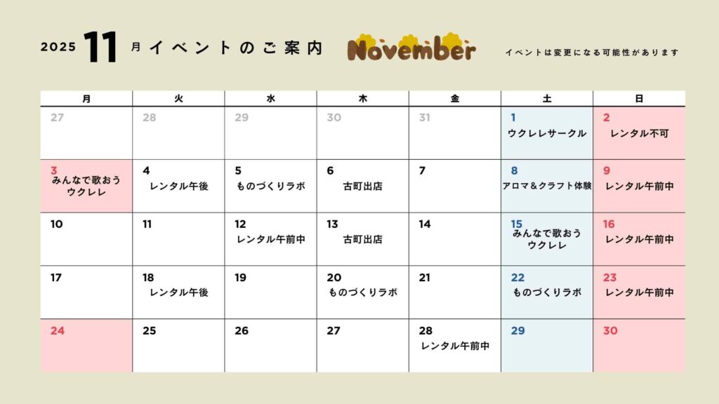 11月は「心をほどく創作月間」。少人数&予約制でゆったりどうぞ。